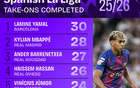 本赛季西甲完成过人最多榜:亚马尔30次居首,姆巴佩28次第二